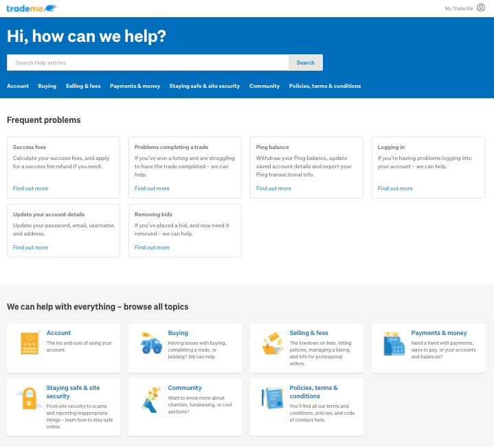 Users often have difficulty navigating the Help Centre's search function because they need to predict how Trade Me will phrase their issue. This can lead to frustration and reduced efficiency when trying to find relevant solutions as they struggle to match TradeMe jargon.Content categorisation and visuals